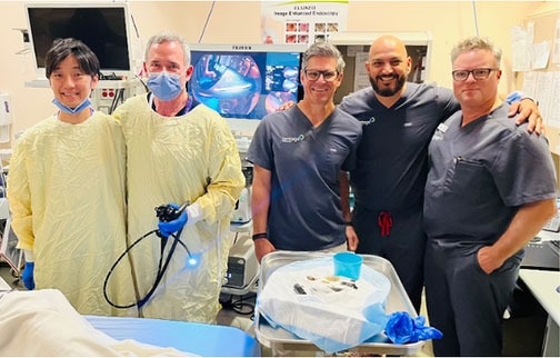 富士フィルム細径処置スコープ「EG-840TP」のカナダ初使用時の症例(一番左が筆者)